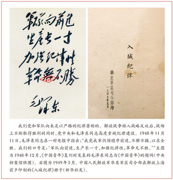 紀律上的要求稍微放松,病毒就會趁虛而入。比如前文提到,從1948年1月到1949年1月,黨中央反復多次強調加強紀律建設,應該說總的情況是很好的,但也有極個別部隊思想上沒有始終繃緊弦。1949年4月23日,第三野戰軍第35軍進入南京,南京解放,但入城部隊部分官兵破壞紀律的行為,嚴重損害了人民解放軍的聲譽和形象。毛澤東同志親自為中共中央軍委起草電報,對此予以嚴厲批評:“從三十五軍在南京數天內所犯無政府無紀律錯誤行為看來,你們過去在準備渡江時期,對于外交政策及其他許多事項(例如軍隊在城市中看戲、看電影、洗澡、坐電車、坐公共汽車等事必須和各界人民同樣買票,不許特殊,以及未得上級許可不得接受人民慰勞等)似乎沒有明確規定。如果沒有規定,你們應速規定,通令各軍一體遵行。如果過去已有規定,三十五軍故意違犯,則除檢查該軍工作做出結論通令各軍外,應向各軍重申前令,引起注意,不許再有違犯。”并要求“轉發華野、中野,各軍、各師以資警惕”。