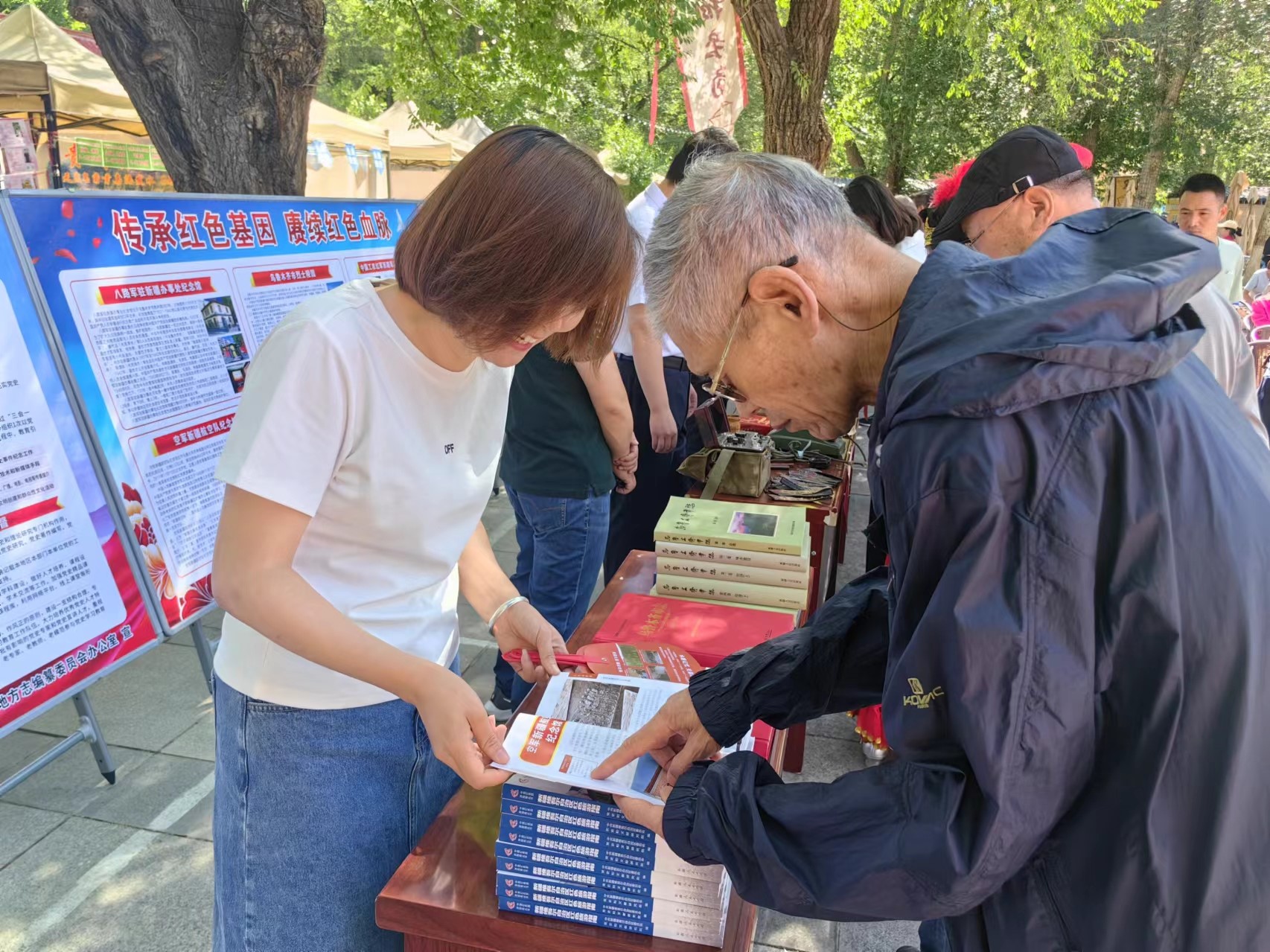 活動現場,《條例》宣傳欄和以“傳承紅色基因 賡續紅色血脈”為主題的紅色旅游景點宣傳板,配合著宣傳片《烏魯木齊這十年》的播放,吸引了過往的市民紛紛駐足觀看。市委史志辦干部現場解讀《條例》,結合新疆維吾爾自治區黨委黨史和文獻研究院編輯出版的《新疆維吾爾自治區紅色旅游指南》一書,向市民群眾宣傳家鄉豐富的紅色旅游資源。不少群眾在現場認真翻閱書籍,在書中找兒時生活的地方,感受黨和政府挖掘和保護紅色資源取得的成就。