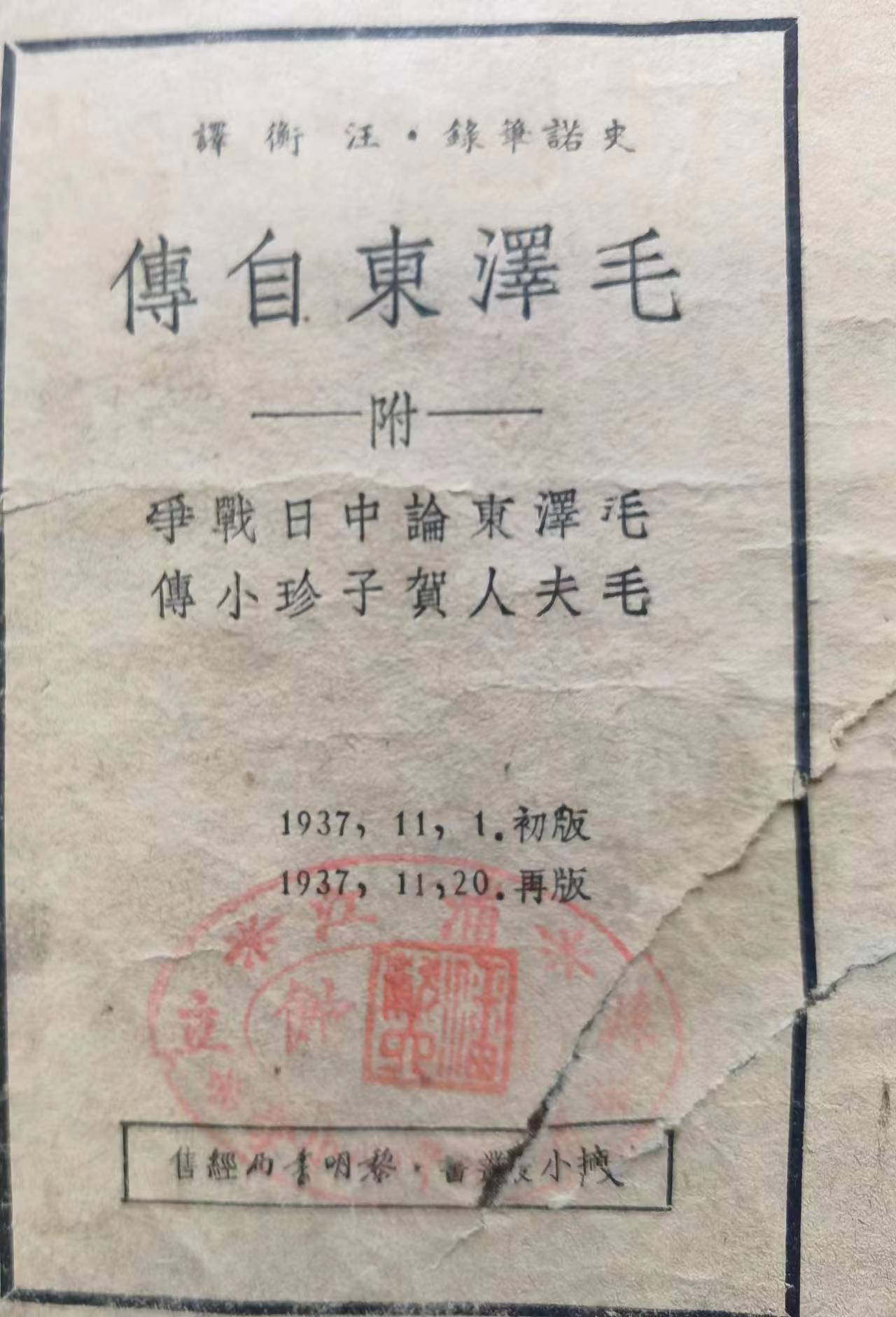 1936年7月至10月,美國記者埃德加·斯諾在陜甘寧蘇區訪問。其間,毛澤東接受了斯諾的采訪,將自己的個人生平經歷告訴了斯諾。1937年春,斯諾應美國紐約《亞細亞》(即ASIA)月刊編輯的要求,以《毛澤東自傳》為題,將他關于毛澤東生平的訪談集中整理成文,于1937年7月至10月,在《亞細亞》月刊第37卷第7號至第10號上連載。時任上海復旦大學教授的孫寒冰偶然讀到此文,異常欣喜,隨即組織他的學生汪衡將其翻譯成中文,在孫寒冰所創辦的《文摘》月刊和改刊后的《文摘戰時旬刊》連載。在此基礎上,上海文摘社出版了單行本《毛澤東自傳》,由史諾(即斯諾)錄,汪衡譯,黎明書局經售,1937年11月1日初版、11月20日再版。徐漢松同志向信息資料館捐贈的即是1937年11月20日的《毛澤東自傳》再版本。該書封面印有毛澤東側面圓形頭像,潘漢年手書書名,記述了毛澤東自誕生到革命早期的人生歷程和思想脈絡,從不同側面展現了毛澤東的生平事跡和領袖風范,對研究毛澤東早期經歷和思想,具有重要史料價值。