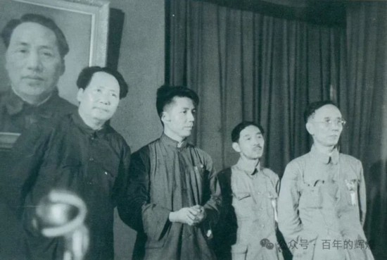 1949年7月2日,毛澤東出席中華全國文學藝術工作者第一次代表大會,右起:郭沫若、茅盾、周揚。