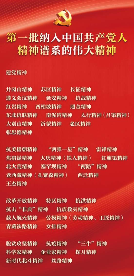 問渠那得清如許?為有源頭活水來。偉大建黨精神和中國共產黨人精神譜系是源與流的關系,源遠才能流長;是根與葉的關系,根深才能葉茂。我們黨在各個歷史時期形成的不同精神,在黨的百年奮斗歷程中不斷繁衍和傳承,本質都是偉大建黨精神在不同時代的具體呈現和深度拓展,是偉大建黨精神的豐富和發展。井岡山精神、長征精神、遵義會議精神、延安精神、西柏坡精神、抗美援朝精神、“兩彈一星”精神、改革開放精神、特區精神、脫貧攻堅精神、抗疫精神等偉大精神,構建起了中國共產黨人的精神譜系。以偉大建黨精神為源頭的這一系列精神,跨越時空、歷久彌新,集中體現了黨的堅定信念、根本宗旨、優良作風,凝聚著中國共產黨人艱苦奮斗、犧牲奉獻、開拓進取的偉大品格,深深融入我們黨、國家、民族、人民的血脈之中,為我們立黨、興黨、強黨提供了豐厚滋養。