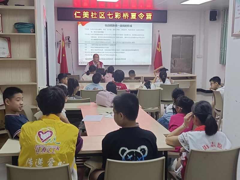 7月19日,研究室為江海區江南街道仁美社區的青少年學生送去了一堂“家門口”的黨史課。征集編研科業務骨干以“銘記全民族抗戰歷史 弘揚偉大的抗戰精神”為題,為社區青少年講述了抗戰故事和革命先烈的英勇事跡,使他們對中國共產黨偉大抗戰精神的豐富內涵有了更加深刻的理解。