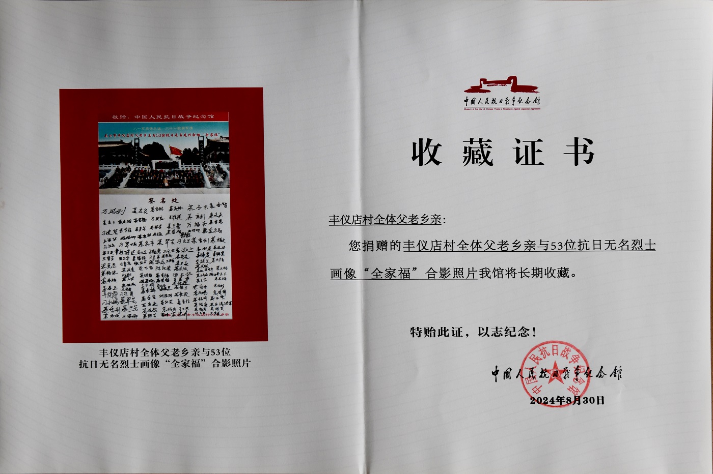 8月30日,山東省煙臺市委黨史研究院聯合龍口市委黨史研究中心、龍口市豐儀店村黨支部和濟南第一團“鋼八連”官兵代表,赴京向中國人民抗日戰爭紀念館捐贈了龍口市豐儀店村父老鄉親與53位抗日無名烈士畫像合拍的高1.85米、寬1.1米“全家!。中國人民抗日戰爭紀念館文物部主任趙迪立主持了捐贈儀式,煙臺市委黨史研究院院長李丕志講述了豐儀店村“全家福”照片背后的故事。中國人民抗日戰爭紀念館黨委書記、館長羅存康出席捐贈儀式,接收巨幅照片,向豐儀店村頒發了收藏證書,并作了講話。羅存康感慨地說:“‘全家!@個作品非常特殊,入選了中國人民抗日戰爭紀念館,我們和豐儀店村的村民一起,在中國人民抗日戰爭紀念館這個特殊的地方,進行一個捐贈,我覺得非常珍貴。你想想一個村里紅色傳承的故事,能到中國人民抗日戰爭紀念館里來展覽,是很不容易的。我還有一個愿望就是中國抗日戰爭紀念館可以到那里舉行巡展,把我們的抗戰內容拿到豐儀店村展覽。另外,我們還要把豐儀店村紅色傳承的故事拿到北京來展覽,我們共同傳承一個精神——抗戰精神!贝舜尉栀浕顒右鹆藦娏曳错,中央電視臺、山東電視臺、煙臺電視臺以及鳳凰新聞、大眾日報、煙臺日報、齊魯晚報、齊魯壹點、大眾網、膠東在線、大眾新聞等眾多主流媒體紛紛轉發報道。豐儀店村這張“全家!闭掌壓伪豢箲痧^收藏?一場捐贈活動為何能夠引起強烈反響?這張照片背后到底有著怎樣的感人故事呢?