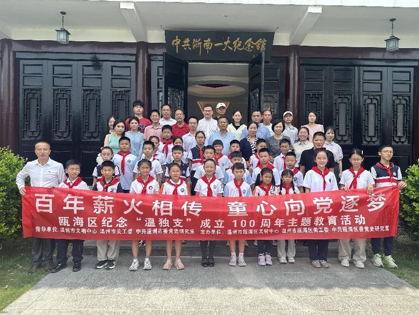為紀念中共溫州獨立支部成立100周年,近日,由浙江省溫州市甌海區(qū)委黨史研究室、區(qū)文明中心、區(qū)關工委聯(lián)合主辦的“百年薪火相傳 童心向黨逐夢”——紀念“溫獨支”成立100周年主題教育活動在中共浙南一大紀念館舉行。