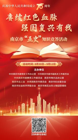 今年是中華人民共和國成立75周年,《黨史學(xué)習(xí)教育工作條例》實施第一年。為深入學(xué)習(xí)貫徹習(xí)近平新時代中國特色社會主義思想和黨的二十大、二十屆三中全會精神,扎實推進黨史學(xué)習(xí)教育常態(tài)化長效化,大力營造全社會喜迎國慶濃厚氛圍,由南京市委黨史工作辦公室、市委市級機關(guān)工委、市教育工委、市地方志辦、市總工會、團市委、市婦聯(lián)、市社科聯(lián)、市雨花臺烈士陵園管理局等單位聯(lián)合舉辦的“賡續(xù)紅色血脈 強國復(fù)興有我”南京市“五史”知識競答活動于8月30日啟動。