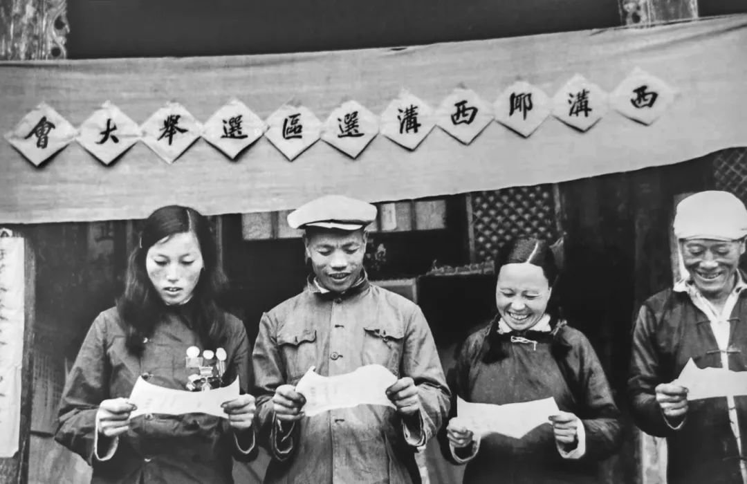 從1953年下半年開始,根據《中華人民共和國全國人民代表大會及地方各級人民代表大會選舉法》的規定,全國各地開展規模空前的普選工作,逐級召開人民代表大會。圖為1953年9月27日,著名勞模李順達、申紀蘭在山西省平順縣西溝鄉西溝選區選舉大會上當選為鄉人大代表