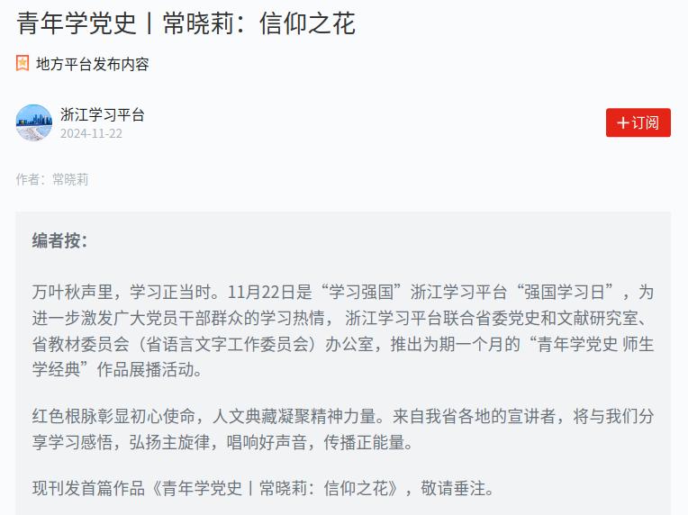 11月22日是學習強國浙江學習平臺“強國學習日”,浙江省委黨史和文獻研究室聯合學習強國浙江學習平臺、省語言文字工作委員會,推出為期一個月的“青年學黨史,師生學經典”作品展播活動。展播作品主要從全省黨史部門進基層宣講的演講稿中選取。
