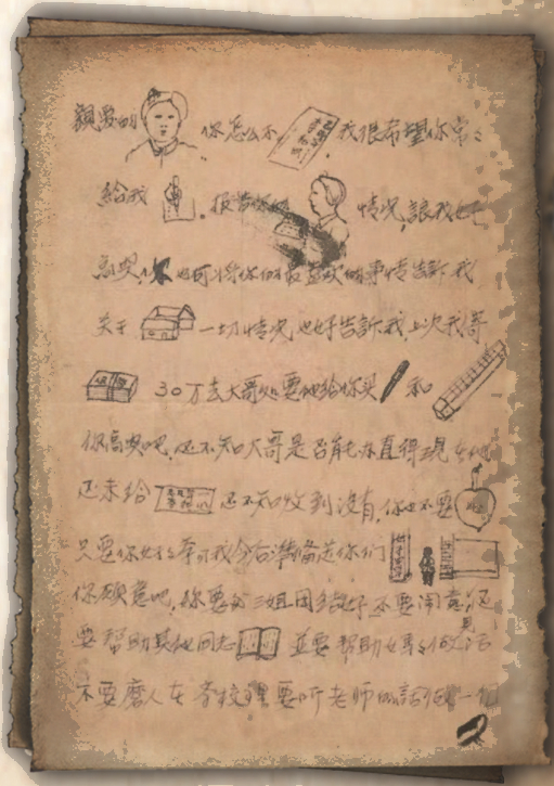“兄現在每天還在學習一些文化業務及政治,在要求進步中追上時代。現在家中你們3個人能認多少字?能寫多少字?能用嗎?不要光為了家中生活環境不好或幫助拾草而耽誤學文化,將來會后悔的。每天不要求高,只要你們能認到5個生字就不斷地學習下去……”