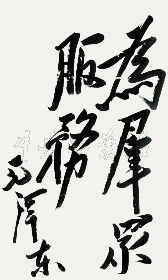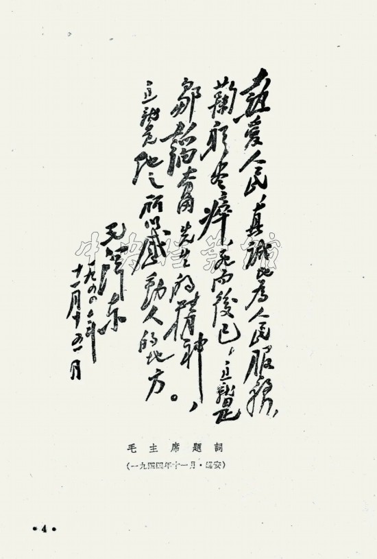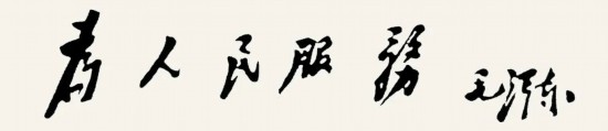 毛澤東題詞中最早出現“為人民服務”字樣是為悼念著名新聞記者、出版家、政論家鄒韜奮。1944年7月,鄒韜奮病逝。中共中央按其臨終前的入黨請求,于9月28日追認他為中國共產黨黨員。11月15日,鄒韜奮追悼大會召開前,毛澤東為鄒韜奮題詞:“熱愛人民,真誠地為人民服務,鞠躬盡瘁,死而后已,這就是鄒韜奮先生的精神,這就是他之所以感動人的地方。”這個題詞是按照傳統書寫習慣,從右往左、從上往下書寫的,其中“為人民服務”5個字后來被單獨擇出,按照現代書寫習慣編排成橫寫版,鐫刻在一些黨政機關的辦公地點。如新華門影壁墻上“為人民服務”題詞的版本,就來源于毛澤東給鄒韜奮的這一題詞。