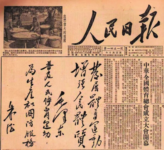1952年6月22日,《人民日報》刊發了毛澤東為中華全國體育總會成立大會所作的題詞“發展體育運動,增強人民體質”。題詞高度凝練概括了毛澤東的體育思想,同時也指明了社會主義新中國體育事業的宗旨所在、使命所在,為體育工作指明了方向。1957年2月27日,毛澤東在最高國務會議第十一次(擴大)會議上的講話中明確提出:“我們的教育方針,應該使受教育者在德育、智育、體育幾方面都得到發展,成為有社會主義覺悟的有文化的勞動者。”將體育列入了培養新社會所需的勞動者最重要的三方面內容之一。1960年3月16日,毛澤東在為中共中央起草的關于衛生工作的指示中提出,“凡能做到的,都要提倡做體操,打球類,跑跑步,爬山,游水,打太極拳及各種各色的體育運動”,將廣泛開展多樣化的群眾體育健身運動作為消除嚴重疾病、改造人民低弱體質的重要舉措。