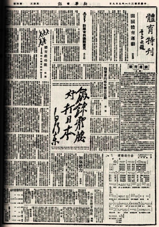 土地革命戰爭時期,毛澤東非常重視各革命根據地的體育運動,1934年1月他在第二次全國蘇維埃代表大會上的報告中專門提到:“群眾的紅色體育運動也是迅速發展的。現雖偏僻鄉村中也有了田徑賽,而運動場則在許多地方都設備了。”全民族抗戰時期,在毛澤東等中央領導同志的關懷關心下,抗日根據地的體育運動繼續頑強地向前發展。1937年8月6日,毛澤東在陜甘寧邊區第一屆抗戰動員體育運動大會閉幕詞中提出,要努力學習軍事體育來武裝我們的手足,學習政治來武裝我們的頭腦。1942年9月9日,《新華日報》刊發了毛澤東的題詞“鍛煉體魄,好打日本”,當日恰逢國民政府組織的第一屆體育節,毛澤東的題詞對在抗戰戰略相持階段鼓舞民心士氣、鞏固抗日民族統一戰線、推動抗日軍民以堅強體魄和必勝信心奪取抗戰最終勝利起到了積極作用。