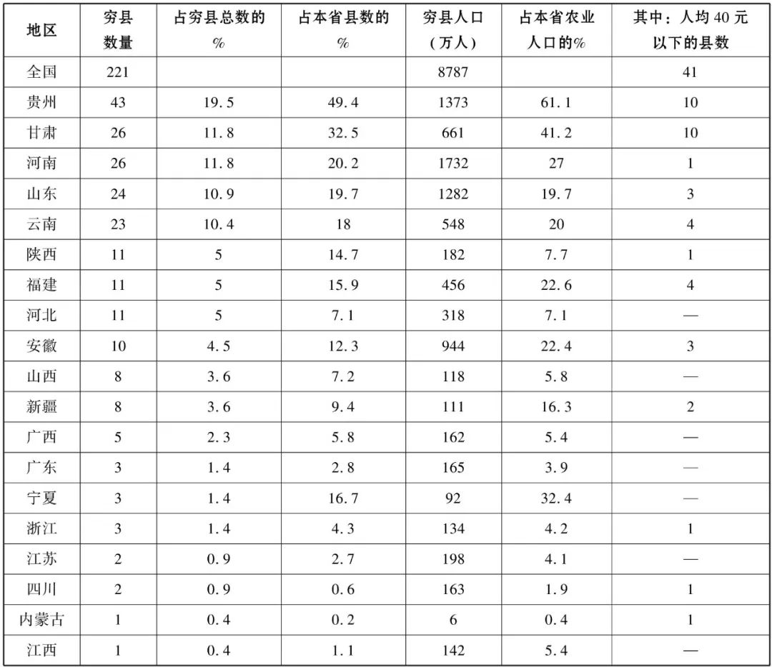 表1顯示,1977年至1979年各省、區連續三年人均分配收入50元以下窮縣數量,超過20個的有五個省,分別為貴州、甘肅、河南、山東和云南;10個及以上的有九個省,除上述五省外,還有陜西、福建、河北和安徽。九個省、市未出現在上表,因為“北京、天津、上海、湖南、湖北、遼寧、吉林、黑龍江、青海9省、市,沒有人均分配收入連續3年都在50元以下的窮縣,其中北京、天津、上海、吉林4省、市在1977年至1979年3年中,沒有出現過人均分配收入50元以下的窮縣”。