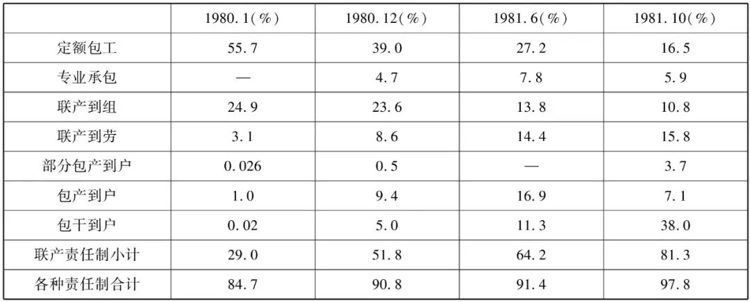 有論者指出,家庭聯產承包責任制從初露端倪到全面確立,經歷了兩次政策突破:第一次是“從中央明確規定‘不許包產到戶,不許分田單干’,到允許特別貧困地區可以包產到戶”;第二次是“明確規定包產到戶(包干到戶)不再限制在特定貧困地方,而可以由農民自主選擇”。筆者贊同對前兩次政策突破的總結,不過從各省最終確定家庭聯產承包責任制的實際歷程來看,還存在第三次政策突破,其主要內容是明確家庭聯產承包責任制的廣泛適應性,特別是以宜興包干到戶經驗說明包干到戶適用于經濟發達地區。第三次政策突破后,家庭聯產承包責任制作為一種最主要的責任制形式確定下來。