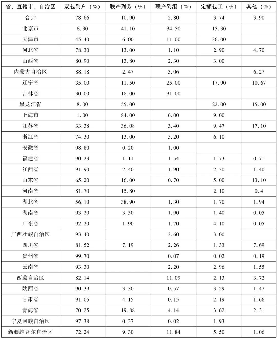 雙包到戶占比在90%以上的有11個省份,和1981年10月統計的雙包到戶超過50%的省份相比,多了湖南、陜西,少了內蒙古、河南;介于80%—90%的省份為內蒙古、西藏和山西、河南、四川;介于70%—80%的省份為新疆、河北、浙江和青海;介于60%—70%的省份為山東;介于50%—60%的省份為湖北;50%以下的為北京、上海、天津和黑龍江、吉林、遼寧、江蘇,其中北京、上海和黑龍江的雙包到戶比例低于10%。雙包到戶占比低于50%的省份均包含農村經濟發達地區和適于機械化地區。這兩類地區在1982年底至1983年春向雙包到戶轉變。1983年1月10日,鐵瑛在《中國農民報》發文,以經濟較發達的嘉興地區的調查材料,說明家庭式的聯產承包責任制“同樣適用于經濟比較發達的地區”。1982年12月24日,黑龍江省委第一書記楊易辰在地市縣委書記會議上的講話中提出:“無論哪種聯產承包責任制形式,只要群眾愿意實行,都要有領導地實行。”這次會議后,黑龍江省家庭聯產承包責任制得到迅速發展,據1983年春節(2月13日)前統計,全省落實各種聯產承包責任制的生產隊已占總數的95%以上,其中“包干到戶占百分之七十三,專業承包、包干分配占百分之七,農機隊(組)承包和機、勞分包占百分之五,聯產到勞(組)占百分之十”。