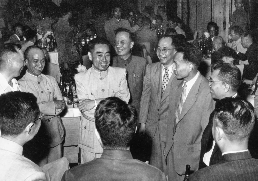 1956年5月26日,在招待出席全國科學規劃會議代表的酒會上,周恩來、聶榮臻、李富春等同科學家們交談