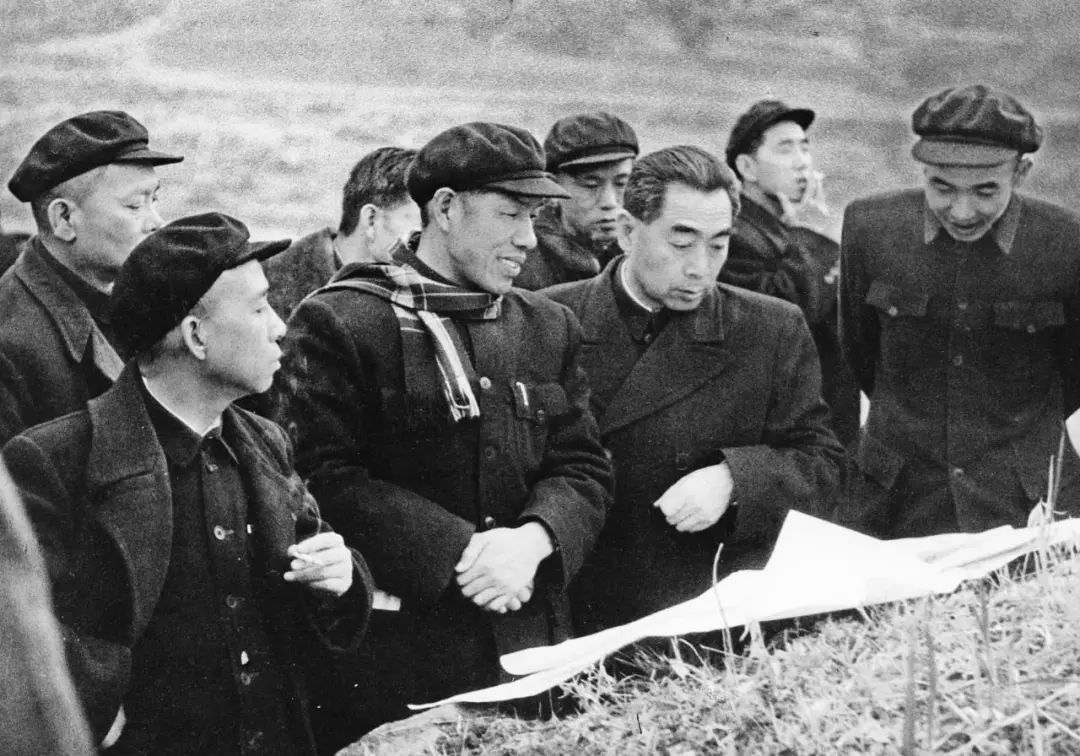 1958年,周恩來(前排右二)和李富春(前排左一)、李先念(后排左一)、王任重(前排右一)在湖北省三斗坪中堡島上現場審查大壩工程設計方案