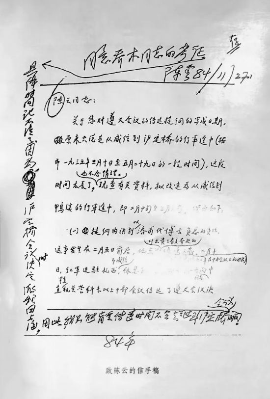 1983年夏,中央黨史研究室請示可否將傳達遵義會議的手稿發表,陳云同志表示同意。然后,他們按陳云同志的回憶,加了編者按,說明手稿形成于從威信到瀘定橋的行軍途中,并將標題改為《遵義政治局擴大會議傳達提綱》,發表于《中共黨史資料》。1984年3月4日,新華社就此發了一個消息,說中央有關部門在對遵義會議的具體情況進行調查的過程中,發現了一份陳云當年傳達會議的手稿。手稿對會議的醞釀過程、主要內容,尤其是中央的組織變動情況等主要史實,都有明確的記載。同年,中央為迎接遵義會議50周年,決定以中共中央黨史資料征集委員會和中央檔案館的名義,編輯《遵義會議文獻》一書,并收入了陳云同志的這個傳達提綱。胡喬木同志在審閱這本書時感到,對這份文獻形成時間的說明前后相距約有三個月,顯得過于籠統,故讓我問問陳云同志能否講得再具體一些。陳云同志答復,具體時間實在記不清了,因為瀘定橋會議決定派他回上海,因此只能肯定傳達時間不會超過瀘定橋會議。于是,喬木同志根據那份手稿的內容和紅軍長征中重大事件的發生時間,判斷手稿形成于中央到威信之后,但在到鴨溪、茍壩之前,即2月中旬至3月上旬之間。因為,其中說到了在威信召開的扎西會議決定張聞天接替博古負總責,卻沒有說到茍壩會議上決定成立由毛澤東、周恩來、王稼祥組成新“三人團”的事。然后,他給陳云同志寫了封信,請他對自己的考證予以批示。信是11月25日寫的,陳云同志11月27日即批示,表示同意喬木同志的考證。至此,關于陳云同志的遵義會議傳達提綱的形成時間、地點、用途,以及發現和認定的過程,基本上都搞清楚了。