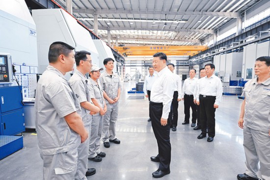 2025年5月19日至20日,中共中央總書記、國家主席、中央軍委主席習近平在河南考察。這是19日下午,習近平在洛陽軸承集團股份有限公司智能工廠考察時,同企業職工親切交流。 新華社記者 燕雁/攝
