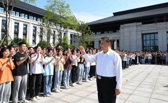 2022年4月25日上午,中共中央總書記、國家主席、中央軍委主席習近平來到中國人民大學考察調研。這是習近平向師生們揮手致意。新華社記者 謝環馳 攝