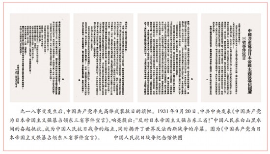 中國共產(chǎn)黨自成立之日起就把實現(xiàn)中華民族偉大復(fù)興作為自己的歷史使命,捍衛(wèi)民族獨立最堅定、維護(hù)民族利益最堅決、反抗外來侵略最勇敢。在爭取民族解放的偉大斗爭中,中國共產(chǎn)黨始終從政治上把握方向、大勢、全局,為全民族抗戰(zhàn)勝利發(fā)揮了不可替代的重要引領(lǐng)作用。面對窮兇極惡的日本軍國主義侵略者,我們黨在民族危亡的歷史關(guān)頭率先高舉武裝抗日旗幟。基于對政治形勢的科學(xué)分析,作出了日本帝國主義同中華民族的矛盾上升為主要矛盾的重大判斷。縱觀抗戰(zhàn)全過程,無論是領(lǐng)導(dǎo)東北抗日聯(lián)軍頑強(qiáng)抵抗,還是廣泛開展抗日救亡運動,無論是倡導(dǎo)建立抗日民族統(tǒng)一戰(zhàn)線,還是確立全面抗戰(zhàn)路線,我們黨始終勇立潮頭挺膺擔(dān)當(dāng),以強(qiáng)有力的政治領(lǐng)導(dǎo)推動形成了全民族抗戰(zhàn)的歷史洪流。以毛澤東同志為主要代表的中國共產(chǎn)黨人,在推進(jìn)馬克思主義中國化的進(jìn)程中,把指導(dǎo)抗戰(zhàn)實踐作為理論創(chuàng)新的重要源泉,以深遠(yuǎn)的戰(zhàn)略眼光和高超的政治智慧確立了黨在抗戰(zhàn)時期的方針、任務(wù)和政策,為抗戰(zhàn)勝利提供了科學(xué)指引。