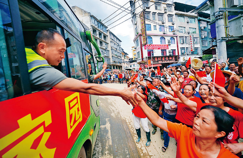 黨的十八大以來,中國(guó)共產(chǎn)黨人繼承和發(fā)揚(yáng)黨的優(yōu)良傳統(tǒng)和作風(fēng),始終保持同人民群眾的血肉聯(lián)系。近期,貴州省榕江縣發(fā)生特大洪澇災(zāi)害,黨員干部沖鋒在前,構(gòu)筑起保護(hù)群眾、守護(hù)家園的堅(jiān)固防線。圖為2025年7月3日,當(dāng)?shù)厝罕娮园l(fā)涌上街頭,送別救援隊(duì)伍,表達(dá)感激之情。 新華社發(fā) 楊武魁/攝