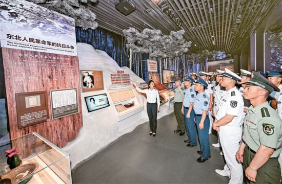 2025年7月7日,紀念全民族抗戰爆發88周年儀式暨《為了民族解放與世界和平》主題展覽開幕式在中國人民抗日戰爭紀念館舉行。圖為當日解放軍官兵參觀主題展覽。 新華社記者 陳曄華/攝