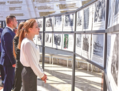 定格共同的勝利,重溫跨越時空的二戰(zhàn)記憶?!般懹洑v史 開創(chuàng)未來”——紀(jì)念中國人民抗日戰(zhàn)爭暨世界反法西斯戰(zhàn)爭勝利80周年圖片展正在白俄羅斯國立偉大衛(wèi)國戰(zhàn)爭歷史博物館展出。圖為觀眾在參觀展覽。 新華社記者 張超群 攝