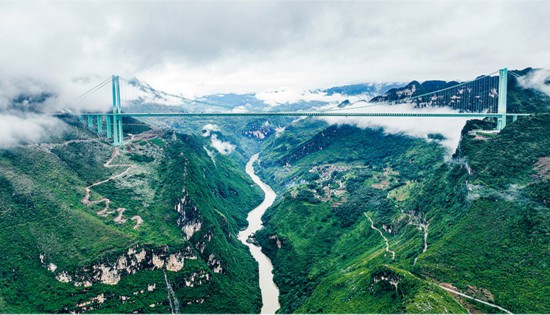 “十四五”時期,我國綜合立體交通網主骨架“6軸7廊8通道”加速完善,基礎設施網絡更加系統完備。2025年9月28日,貴州花江峽谷大橋建成通車。大橋全長2890米,主跨徑1420米,是目前世界山區峽谷第一大跨度鋼桁梁懸索橋;其橋面距水面垂直高度625米,是新的世界第一高橋。圖為9月26日拍攝的貴州花江峽谷大橋。 新華社記者 歐東衢/攝